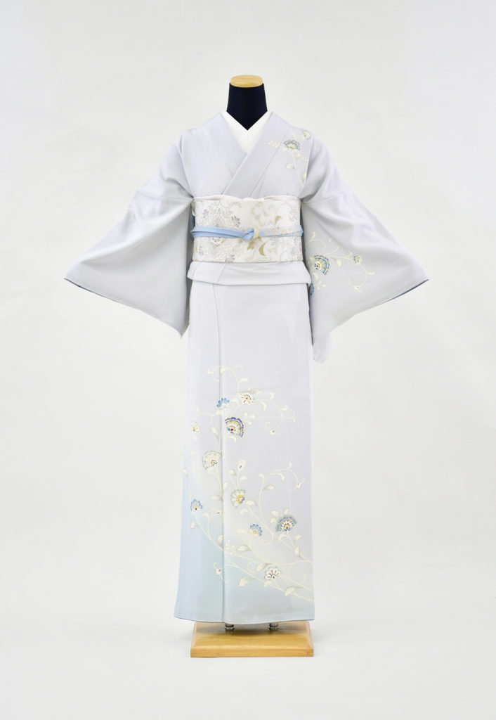 淡いラベンダー色の色目に、白ぬきの柄で艶やかに目を引きます。