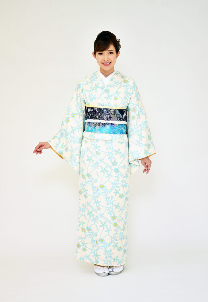 淡い色合いの花模様は優しく可愛らしい着姿で、明るい印象を与えてくれます。