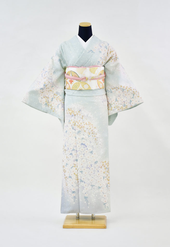 淡い水色の地にさくらが描かれた華やかなな1着です。