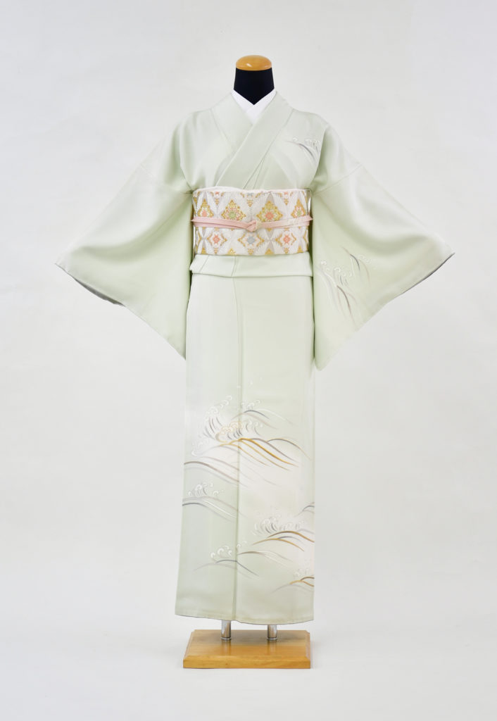 淡いグリーンの地に、波頭の描かれた上品な1着です。