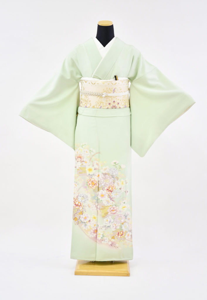 洋花の柄と薄いグリーンの色で華やかに着ていただける着物です。
