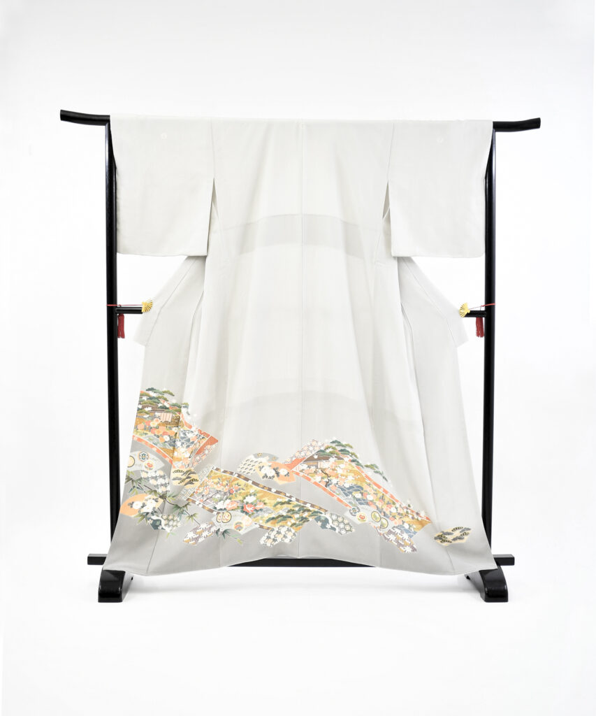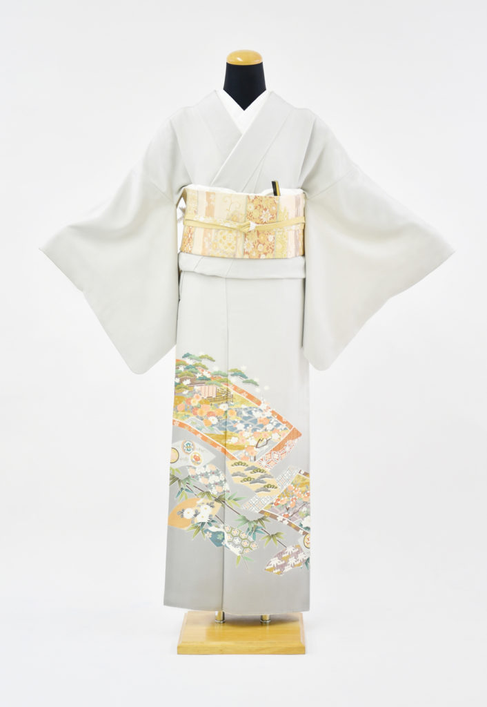 グレーのぼかしで松・梅などの祝い柄の着物です。