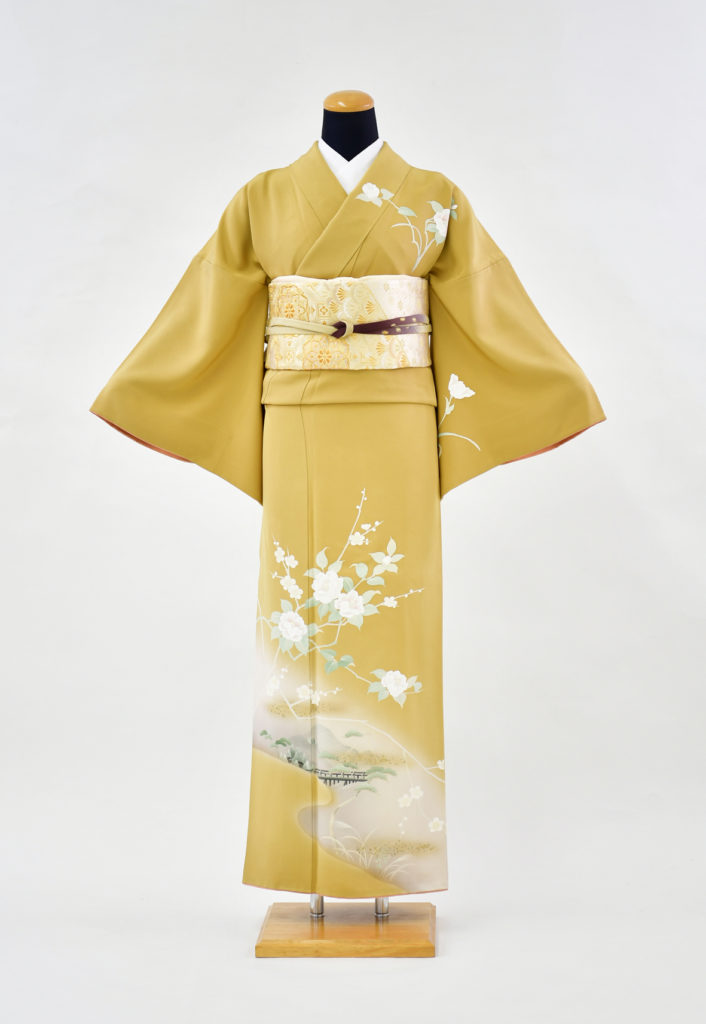 からし色に椿と流水の絵柄。すっきりとした印象を与える1着です。