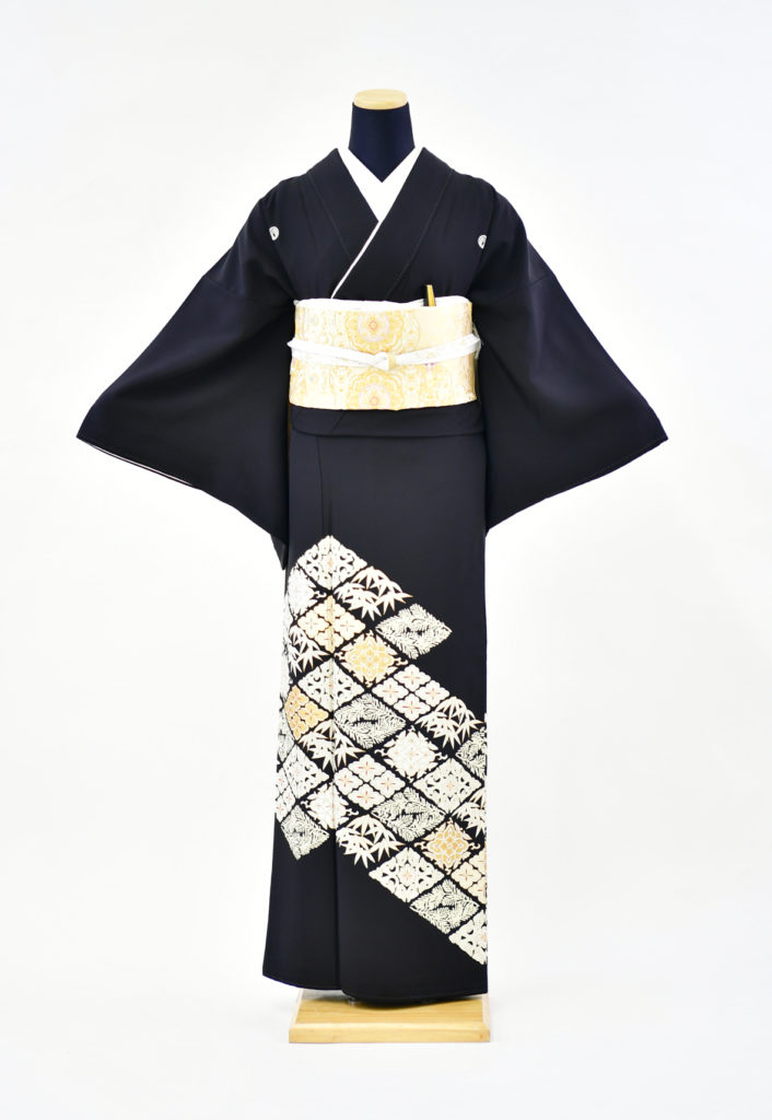 白、金を基調にしたスッキリとした色調に加え、菱文様の直線的な柄付けで、凛とした着姿をお楽しみいただけます。