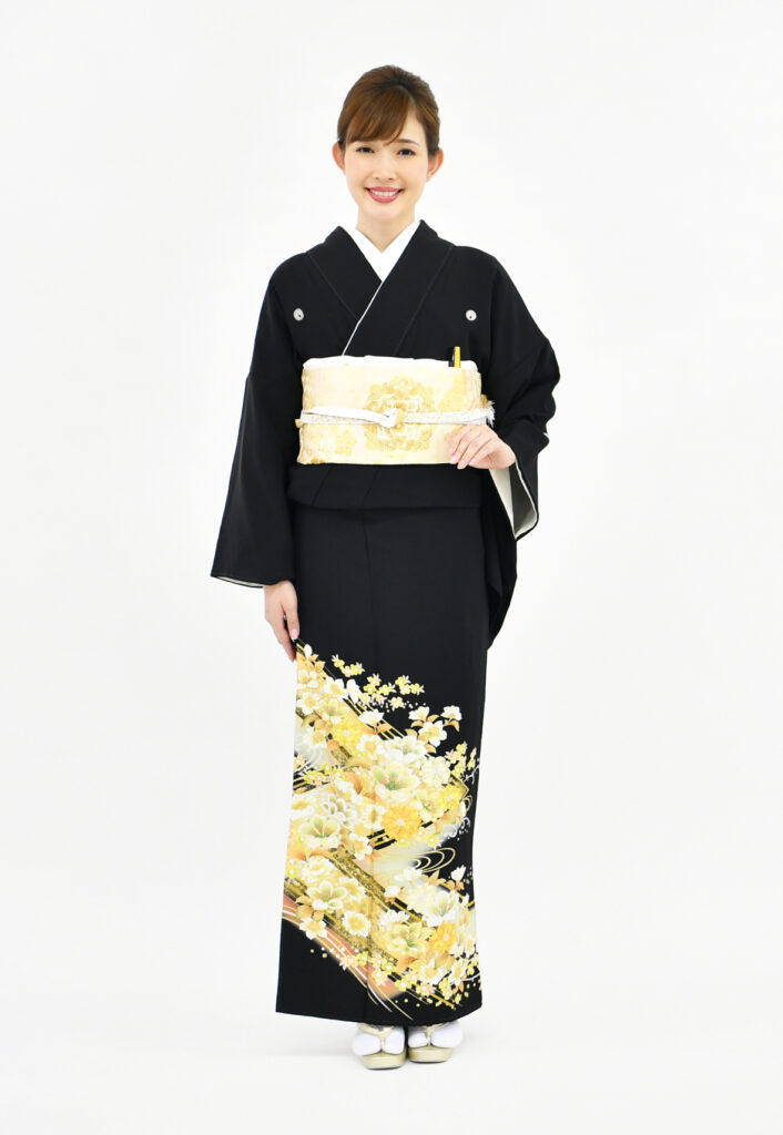 川の流れのような柄付けに洋花を乗せた優雅な着物です。