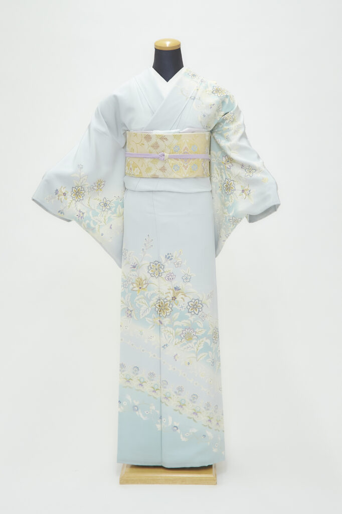 爽やかなブルーに明るい柄付でパーティなどにぴったりの訪問着です。
