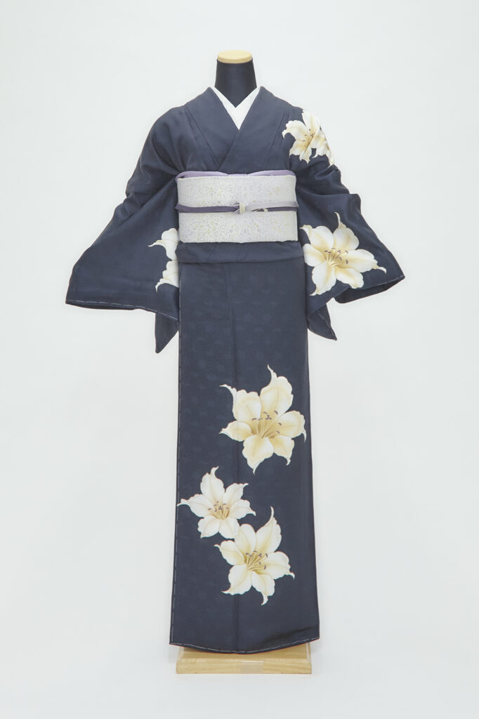 濃い地色に大きな花の柄付で、クールな印象の中にも華やかさがあります。